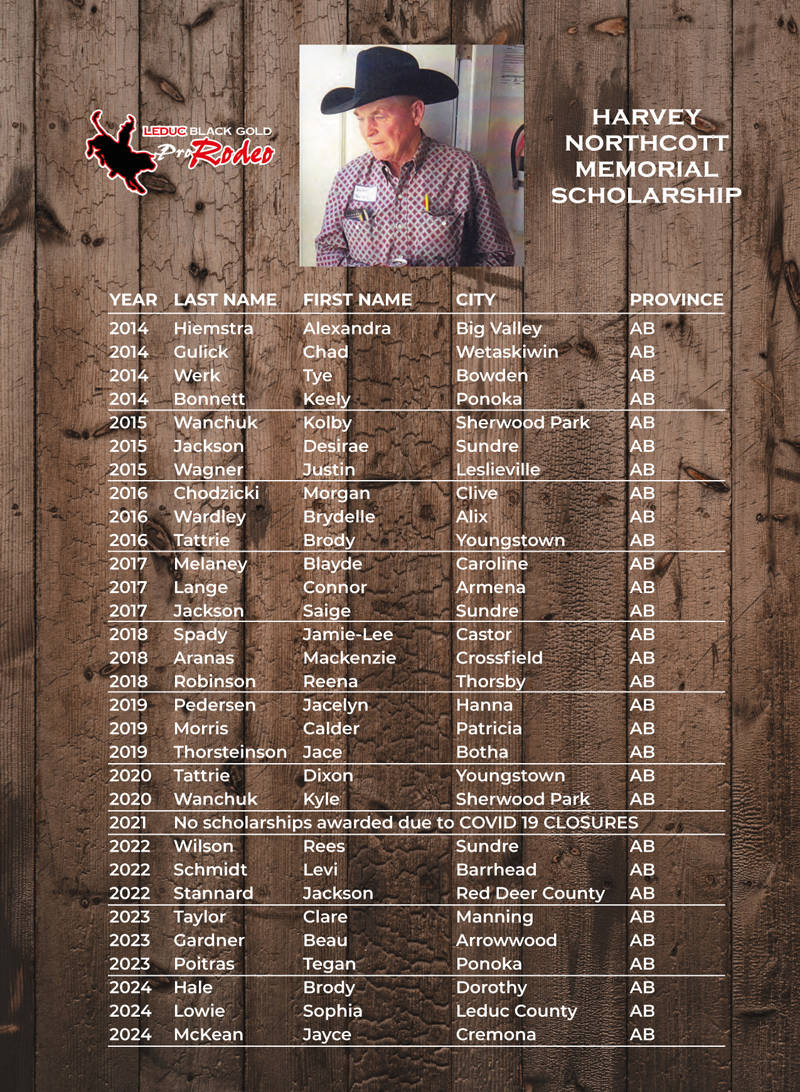 Two $1,000.00 scholarships will be awarded per year – funded by the Leduc Black Gold Rodeo & Exhibition Association in memory of Harvey Northcott.